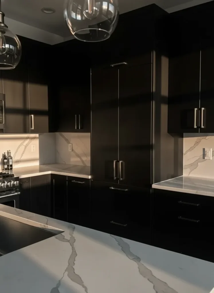I love how this design feels dramatic yet still warm. The mix of dark cabinetry with those light countertops feels like the perfect outfit pairing where everything just works. The soft shadows from the sunset make the whole room feel a little magical and I can already imagine sipping something warm here while the light fades. It is stylish without trying too hard and that balance always wins me over.