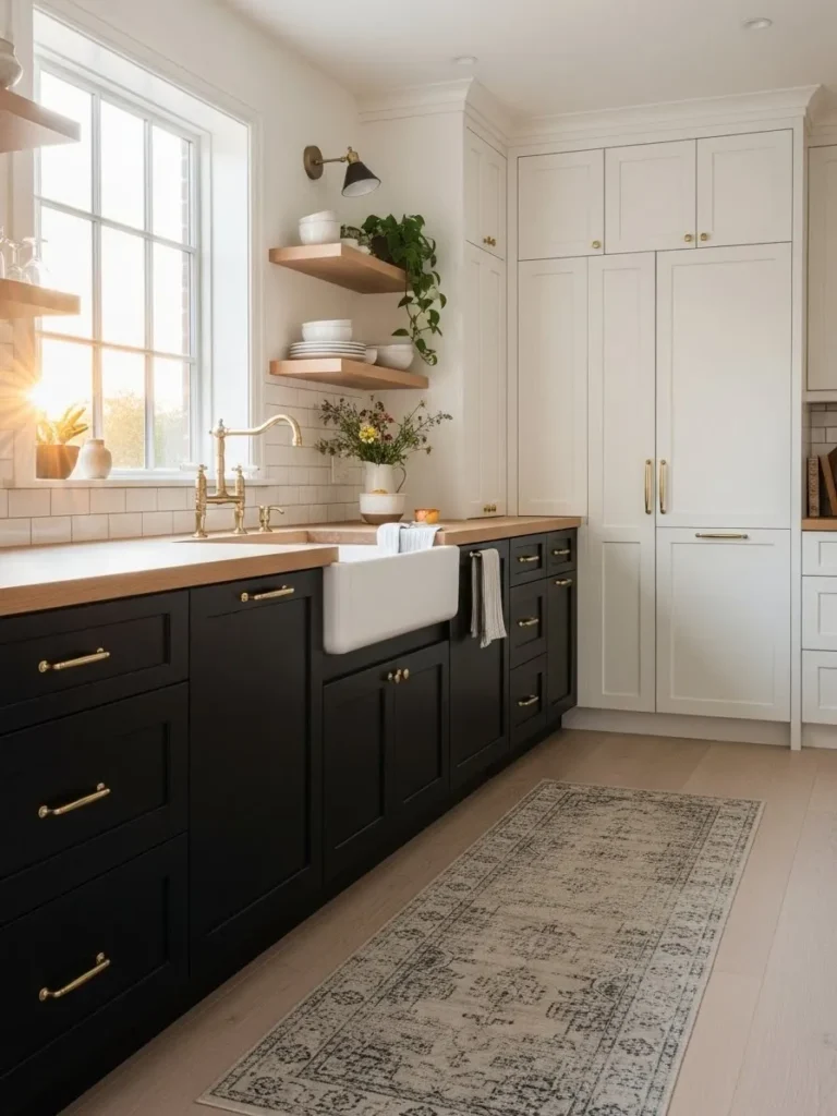 This kitchen mixes bold black lower cabinets with soft warm white uppers for a look that feels modern but still incredibly homey. The black cabinetry grounds the space while the brass hardware adds a sweet touch of sparkle. I love how the warm wood countertops and open shelves balance the contrast and make everything feel more inviting. The farmhouse sink, pretty wall sconce and sunlight pouring in from the window bring in that gentle lived-in charm that makes a kitchen so easy to love.