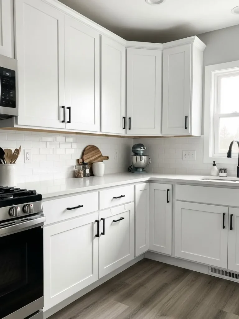 This kitchen leans into a timeless black and white palette with a look that feels fresh and inviting. The bright white Shaker cabinets keep the space feeling airy while the black handles add that little spark of contrast that makes everything pop. The soft gray walls and warm wood toned flooring pull the room together in such a calming way. Even the small details like the cutting boards and mixer tucked neatly in the corner help the whole space feel lived in and loved without ever looking cluttered.