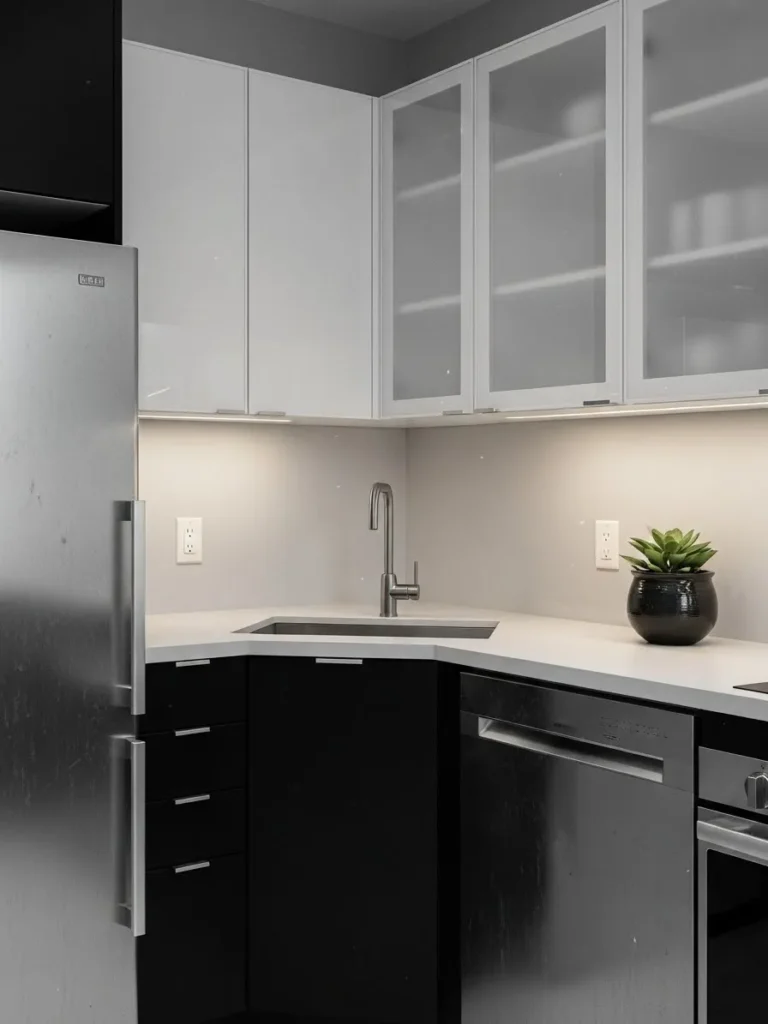 This kitchen showcases a sleek mix of glossy white upper cabinets paired with matte black lowers that instantly creates that crisp black and white contrast we all love. The corner layout feels smart and efficient with a modern square sink, streamlined hardware, and soft under cabinet lighting that gives everything a gentle glow. The frosted glass uppers add a light airy touch while the stainless steel appliances keep the whole space feeling polished and current. It is a small footprint but styled in a way that feels incredibly intentional and uncluttered.