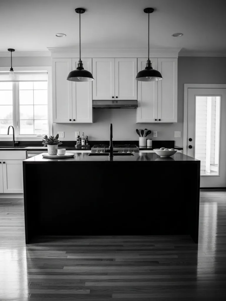 This kitchen brings together the best of modern simplicity and timeless charm. The bold black island instantly anchors the room while the surrounding white shaker cabinets keep everything feeling bright and airy. Soft pendant lights hang above the island and add a gentle glow that makes the whole space feel warm without trying too hard. I love how the clean lines, black hardware, and uncluttered countertops create a look that feels stylish yet totally livable for everyday cooking and coffee sipping.