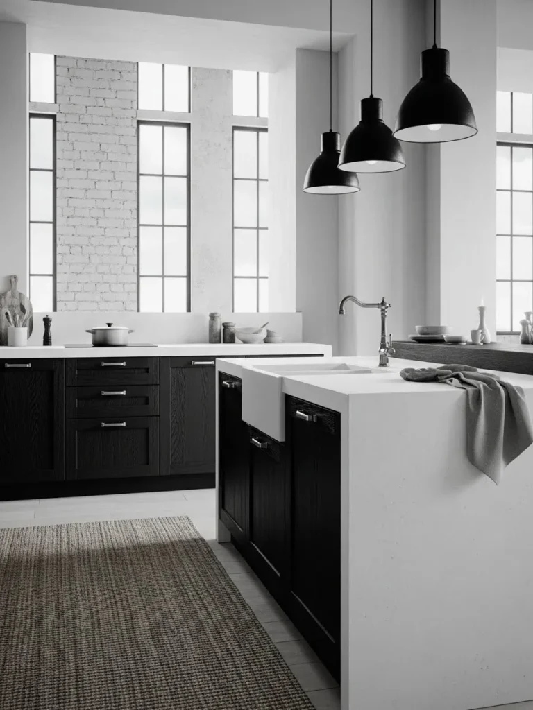 This gorgeous kitchen pairs deep black cabinets with crisp white countertops to create a look that feels both modern and effortlessly cozy. The tall grid windows bring in loads of natural light that softens the contrast and highlights the subtle textures in the brick wall and cabinetry. Sleek chrome hardware keeps everything feeling polished, while the farmhouse sink adds a gentle touch of warmth. The trio of matte black pendant lights ties the whole space together and gives the room a stylish industrial edge without feeling too heavy.