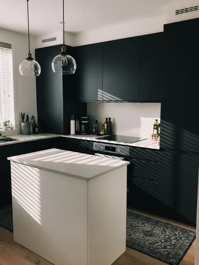 This kitchen pairs bold matte black cabinetry with a crisp white island that instantly brightens the space. Sleek lines and smooth surfaces give everything a modern feel while the warm morning light softens the contrast in the prettiest way. The glass pendant lights add a hint of elegance and let the moody cabinets take center stage. I also love how the subtle patterned rug warms up the floor and makes the whole kitchen feel more inviting. The mix of dark cabinets and a bright island creates a balanced look that feels stylish and cozy at the same time.