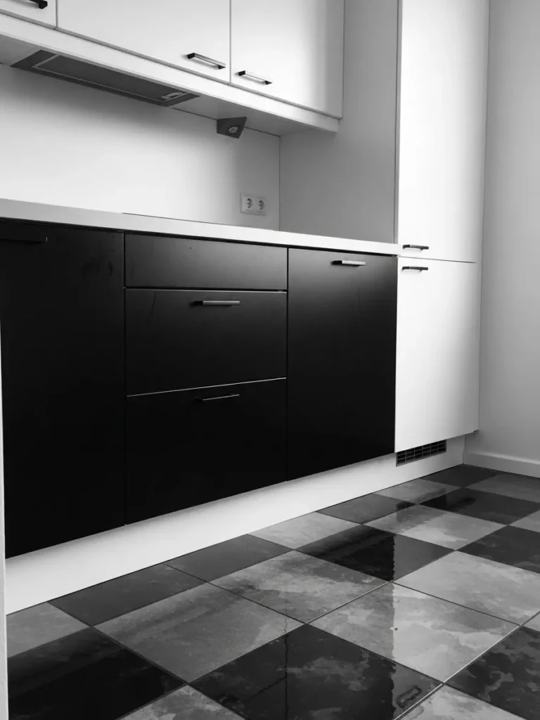 This kitchen leans into a clean two tone palette with crisp white uppers and deep black lowers that feel bold yet effortlessly refined. The smooth cabinet fronts give the space a modern look while the simple metal hardware keeps everything feeling streamlined. I love how the glossy checkered flooring instantly adds personality to an otherwise minimal layout. The contrast between the light walls and dark cabinetry creates a balanced look that feels both structured and cozy at the same time.