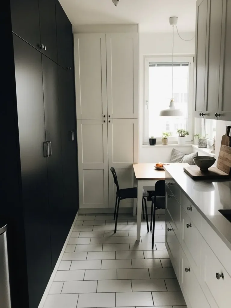 This kitchen leans into a clean black and white palette that feels modern while staying wonderfully homey. The tall cabinetry creates a graceful contrast with one side in deep black and the opposite in crisp white. The layout feels smart for a narrow space since everything runs neatly along the walls. I love how the little breakfast nook sits right beside the window. The soft natural light makes the space feel open and calm. Simple tile flooring keeps the look streamlined while the petite pendant adds just enough charm to make the whole room feel thoughtfully designed.