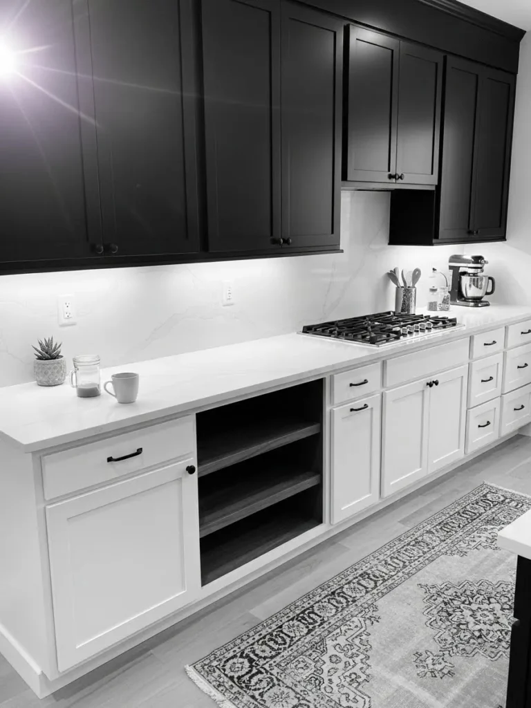 This kitchen pairs deep charcoal upper cabinets with crisp white lowers for a look that feels bold yet totally inviting. The contrast is clean and modern while the simple Shaker style keeps everything grounded and timeless. I love how the bright white countertops and backsplash lighten the space and make the darker uppers feel elegant instead of heavy. The open shelving nook adds a subtle hint of practicality and gives the room a relaxed lived in feel. With the patterned runner softening the lines and a few small accents on the counter the whole space balances style and comfort in such an effortless way.