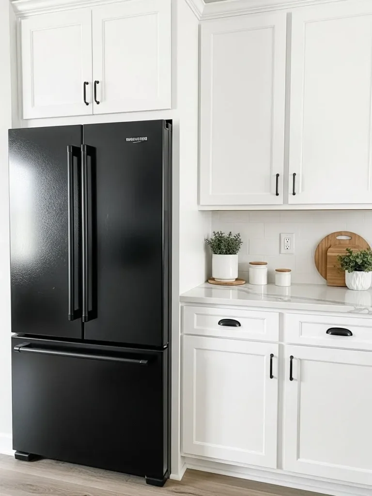 Black Fridge Paired With Bright White Cabinets
