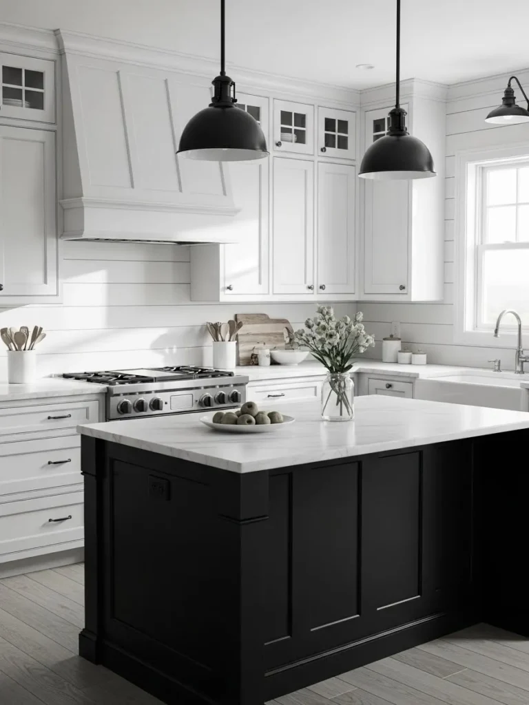 This kitchen blends crisp white cabinetry with a bold black island that instantly grounds the whole space. The clean shaker lines, bright shiplap walls, and polished hardware keep everything feeling fresh while the deep black island adds the perfect touch of contrast. Soft natural light pours through the window and highlights every detail from the farmhouse style apron sink to the sleek stainless range. The overall look feels modern and timeless at the same time which is such a rare and lovely balance.