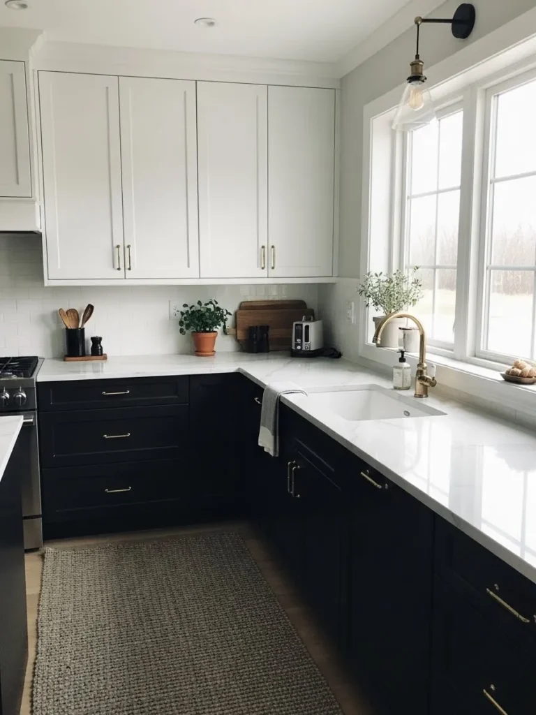 This kitchen pairs crisp white uppers with deep charcoal lowers in a way that feels clean and modern yet still warm enough for everyday life. The bright cabinetry keeps the space feeling light while the darker base cabinets add that satisfying visual depth everyone loves in a two tone moment. Brass hardware brings in a touch of quiet glam and the marble style countertops glide across the layout with a smooth, polished look. The woven rug, potted herbs, and natural cutting boards soften everything and make the whole room feel lived in without losing its sleek charm.