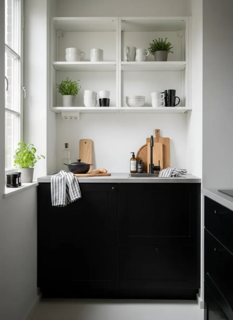 This kitchen makes the most of a compact layout with its crisp white walls and open shelving that keeps everything feeling light and airy. The matte black lower cabinets ground the space with a modern edge while the white countertop keeps the look clean. I love how the open shelves display a simple mix of white ceramics and a few plants since it adds just the right amount of softness. The natural wood cutting boards bring in warmth that balances the bold contrast of black and white in such a charming way.