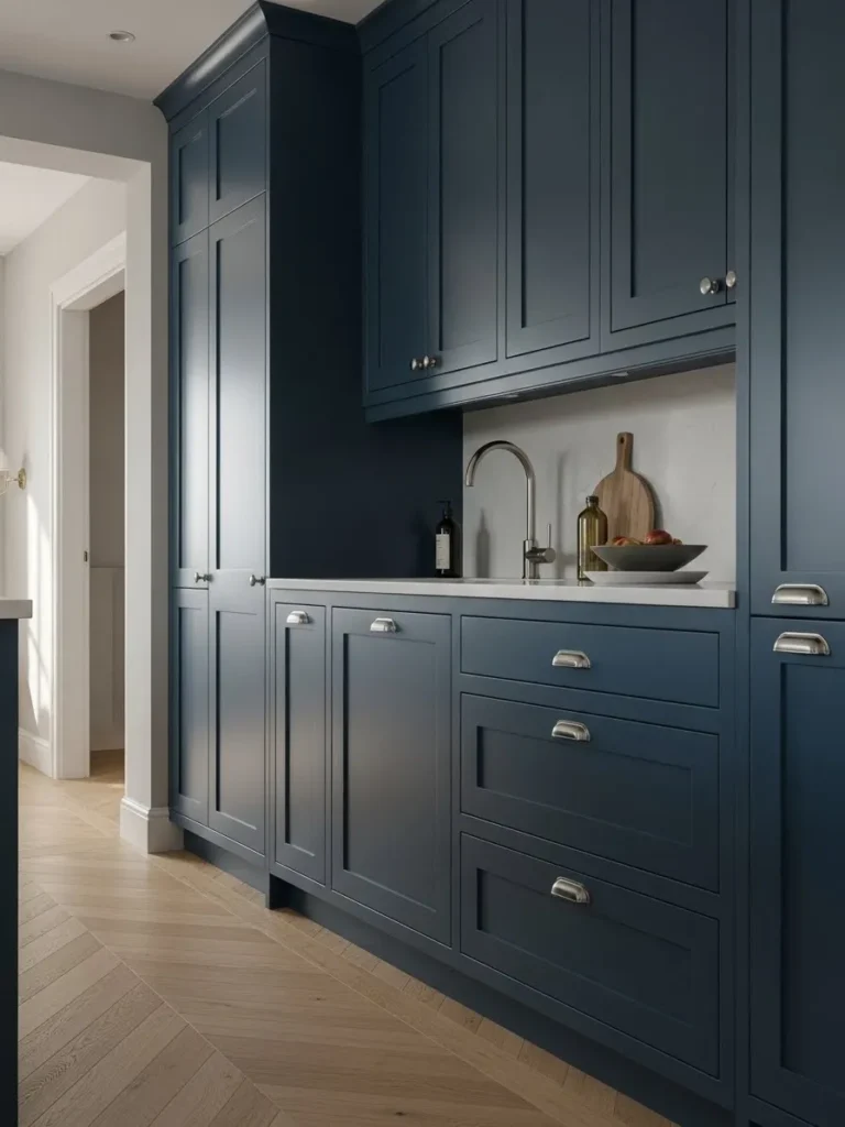 This kitchen features stunning deep blue cabinets that instantly feel calm and grounded. The clean shaker fronts keep the look classic while the rich color adds a sense of quiet luxury. I love how the silver hardware brings a little sparkle without trying too hard. The light wood floors warm everything up and create the prettiest contrast with the darker cabinetry. Even the simple backsplash and minimalist faucet play their part in giving the whole space a crisp and effortless vibe.