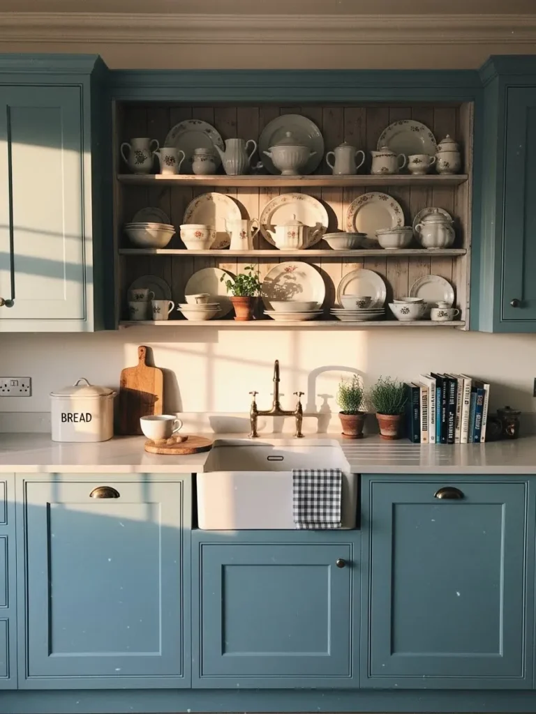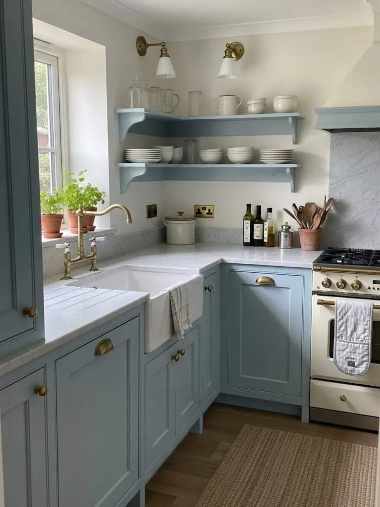 This lovely kitchen brings together soft blue cabinetry, warm natural light, and the sweetest open shelving display that feels straight out of a countryside daydream. The shaker style cabinets in a dusty blue tone instantly set a calm and cozy mood, while the classic farmhouse sink and vintage inspired brass faucet add a gentle nostalgic touch. The open shelves filled with mismatched china make the whole space feel collected and personal. A few terracotta pots with herbs and a stack of well loved cookbooks finish the look in the most effortless way.
