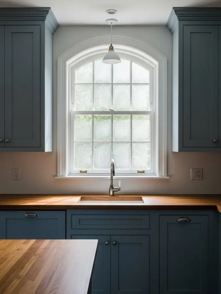 This lovely kitchen pairs calming blue cabinets with warm butcher block countertops that create the sweetest contrast. The star of the space is that graceful arched window that pulls in soft daylight and adds a romantic touch without even trying. The shaker style cabinets feel timeless and steady while the brushed metal hardware keeps everything looking neat and subtle. The simple pendant light above the sink gives just enough charm to feel intentional without stealing attention from the beautiful cabinetry.