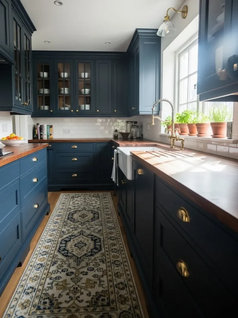This kitchen pairs rich navy blue cabinets with warm butcher block countertops in a way that feels both timeless and wonderfully inviting. The shaker style cabinetry gives everything that cozy, lived in charm while the brass hardware adds a little hint of polish without trying too hard. I love how the glass front uppers lighten the mood and let those neatly stacked dishes shine. The long runner softens the narrow layout beautifully and the farmhouse sink right under the window creates the sweetest little moment with sunlight streaming across the counters. The row of potted herbs adds a touch of life that makes the whole space feel fresh and personal.