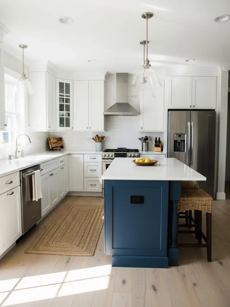 This kitchen brings together the crisp freshness of bright white cabinetry with the grounding charm of a deep blue island. The shaker cabinets keep everything clean and classic while the warm woven stools and natural fiber rug add that hint of coastal coziness. Soft natural light pours across the light wood floors, making the whole room feel open and airy. The stainless steel appliances and glass pendant lights give the space a polished, modern edge that balances beautifully with the island’s rich pop of color.