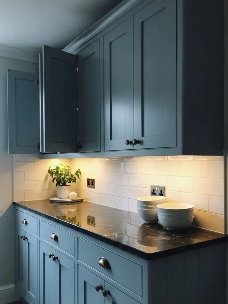 This kitchen feels instantly calming with its soft blue shaker cabinets paired with a warm under-cabinet glow. The brushed brass hardware adds a touch of charm without feeling too fancy and the glossy dark countertop brings in a little contrast that makes the whole space feel polished. I love how the simple white subway tiles keep everything bright while giving the blue cabinets a chance to shine. Even the small potted plant looks like it is thriving in its own spotlight which adds a sweet little hint of life to the countertop.