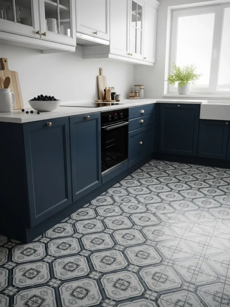 I find this design so charming because it mixes polish with a touch of playfulness. Those blue cabinets feel elegant but never stuffy and the patterned flooring adds a little wink of character that makes me smile. It is the kind of kitchen that feels fresh in the morning light and still inviting when you are cooking dinner after a long day. Honestly, I could see myself spending far too much time here just enjoying how pretty it all is.