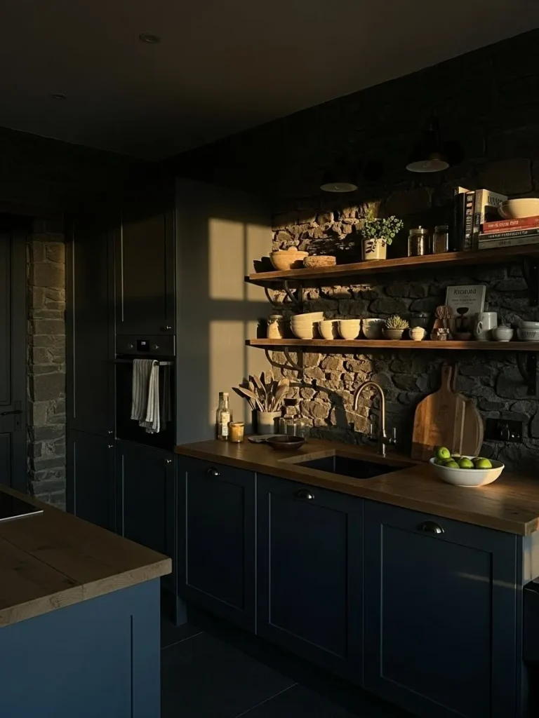 This kitchen pairs deep moody blue cabinets with the most gorgeous rustic stone wall, and the mix feels instantly grounding. The warm wood countertops soften the look and make the space feel inviting, while the simple open shelving brings in that effortless collected style so many of us love. Soft evening light hits the stone in a way that makes every texture glow, giving the room a peaceful and almost cozy retreat feel. The matte cabinet finish keeps everything calm and serene which is perfect for a kitchen that leans warm and lived in rather than polished and formal.