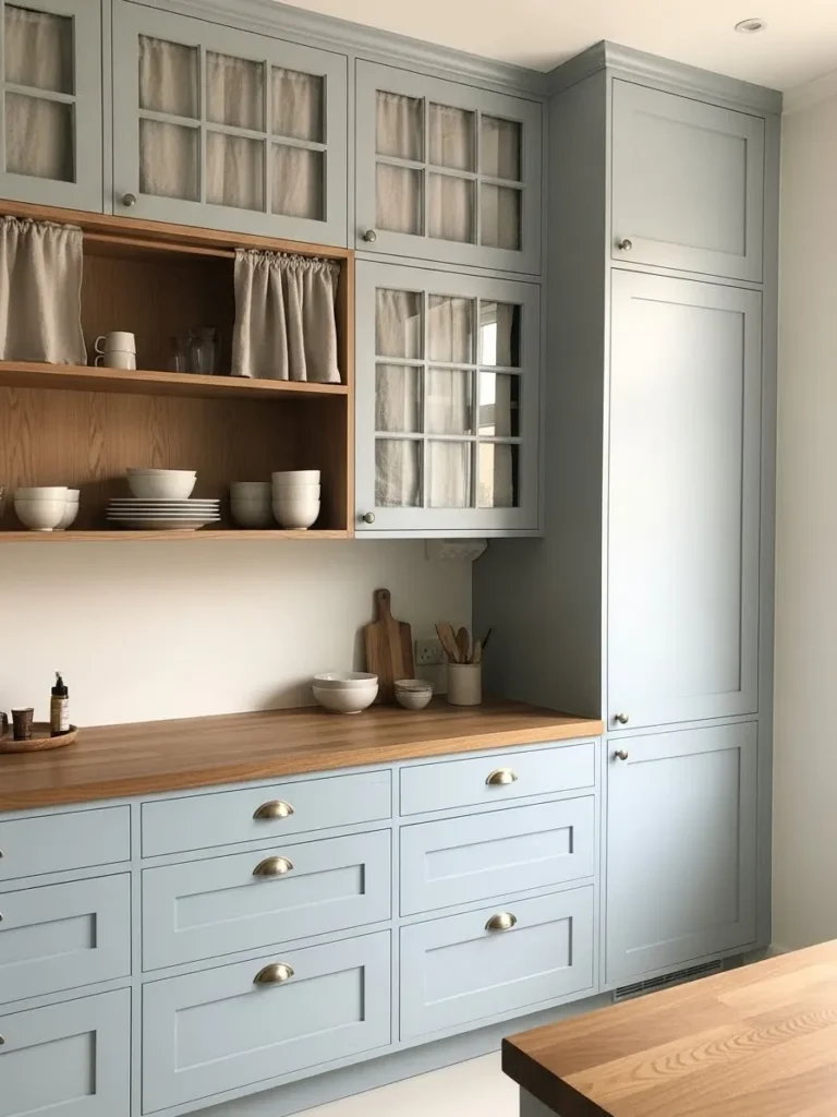 This sweet and simple kitchen design pairs soft powder blue cabinets with warm wood accents to create a space that feels instantly comforting. The shaker drawers and brass cup pulls add a classic touch while the upper cabinets feature charming fabric panels that give the whole room a gentle cottage feel. The open wooden shelves break up the cabinetry with a natural moment that showcases everyday dishes in the prettiest casual way. Everything feels calm, tidy and effortlessly lived in without trying too hard.