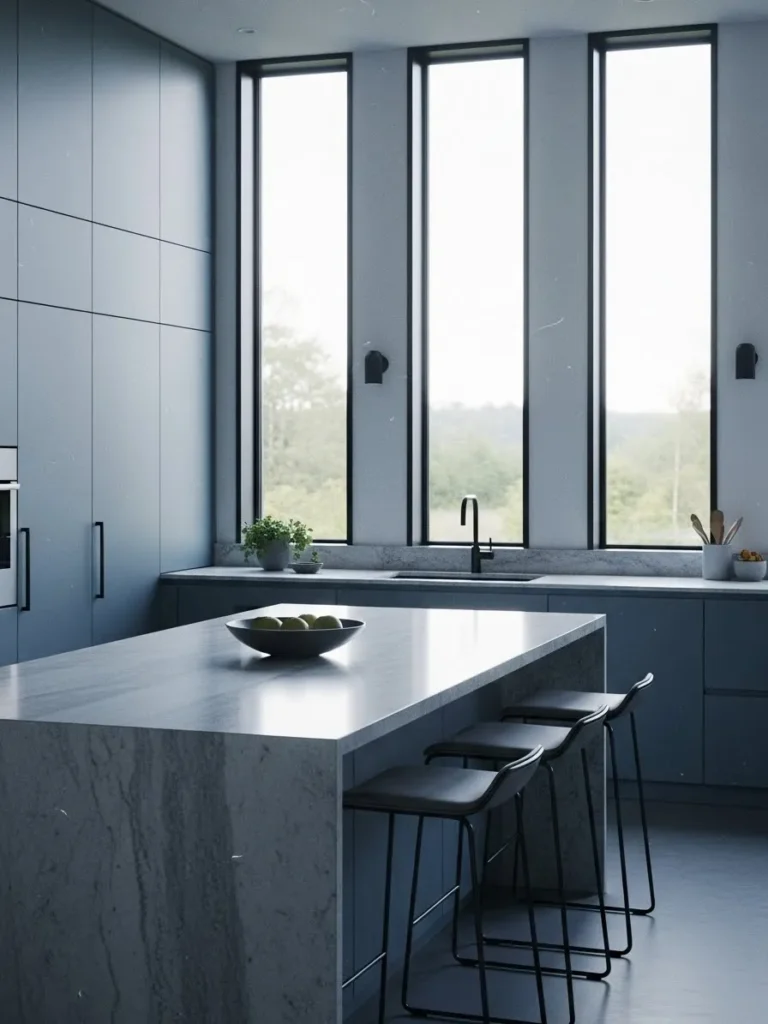 I find this design so refreshing because it proves that simplicity can feel incredibly elegant. The mix of blue tones with all that natural light instantly relaxes me and I can easily imagine myself sipping coffee at that marble island on a slow morning. It feels peaceful yet chic which is one of my favorite combinations in any kitchen.