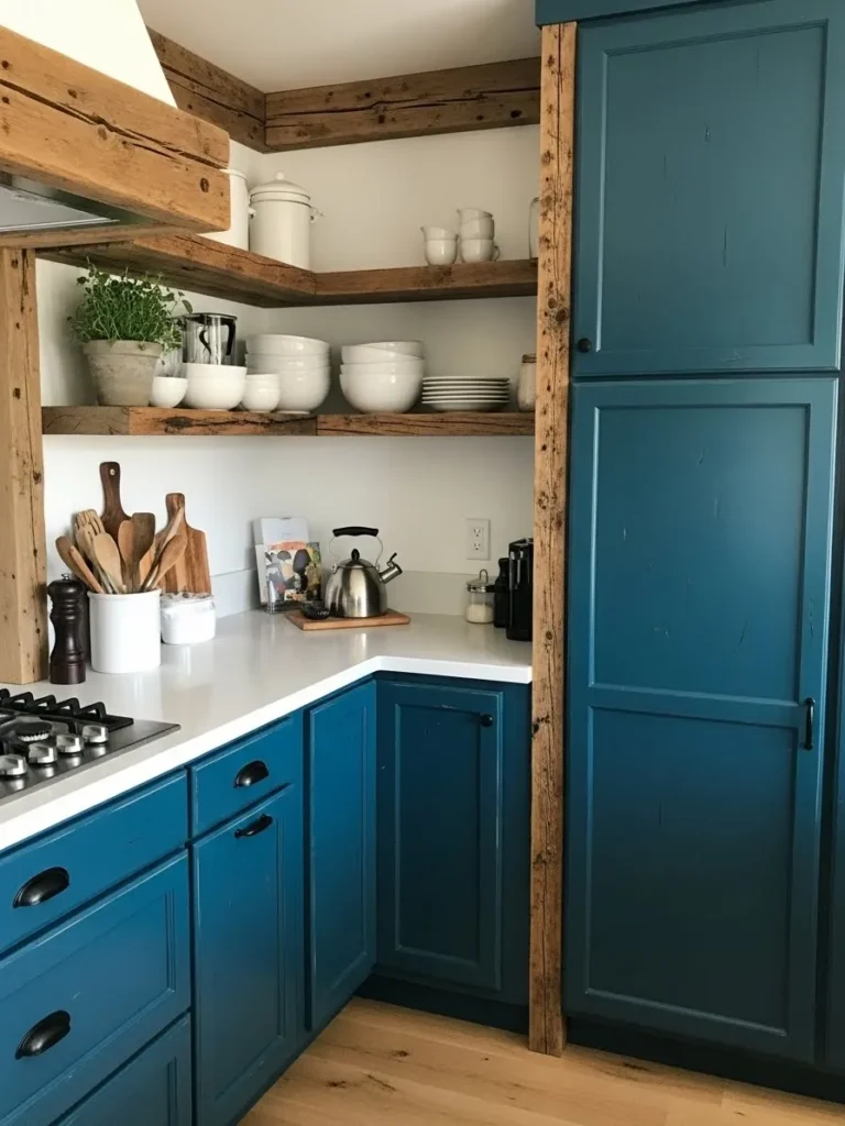 Rustic Blue Cabinets with Warm Wood Accents