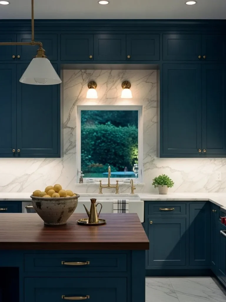 This kitchen shows off a rich deep blue that feels both calm and confident. The cabinetry wraps the space with a smooth modern look while the marble backsplash brings in that soft swirling texture that always feels a little luxurious. Warm brass hardware gives the cabinets a beautiful glow and the matching faucet ties everything together so well. The window nook framed in marble feels like its own special moment and the walnut island adds an earthy balance that keeps the whole room feeling grounded and welcoming.