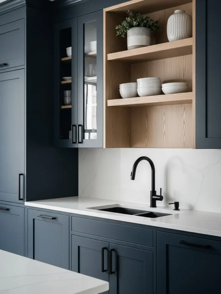 Modern Blue Cabinets with Warm Wood Accents