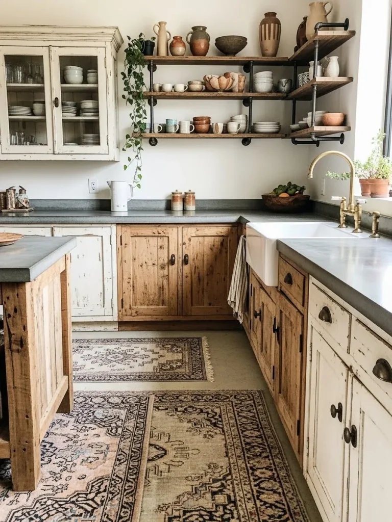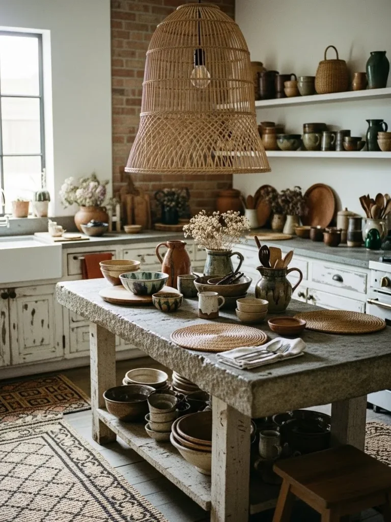 This kitchen brings together so many cozy elements that instantly feel warm and lived in. The focal point is the chunky stone island that looks like it’s been part of the home forever, surrounded by open shelves filled with handmade pottery in soft, earthy tones. A beautiful woven pendant hangs overhead and adds that perfectly imperfect boho texture. The mix of natural woods, weathered cabinetry, layered rugs, and little touches like dried flowers and woven placemats create a relaxed farmhouse atmosphere that feels both artistic and completely welcoming.