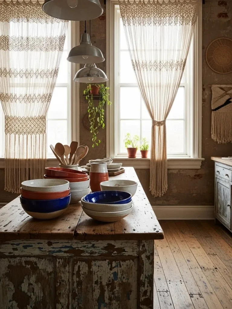This cozy boho farmhouse kitchen feels like a warm hug wrapped in sunlight. The weathered wood island brings all the charm with its perfectly imperfect chippy paint, while stacked ceramic bowls in earthy reds and deep blues add that artistic, collected look so many of us adore. Soft macramé curtains filter the light in the prettiest way and instantly soften the rustic textures around the room. Even the simple hanging planters and vintage style metal pendants help the space feel relaxed and beautifully lived in. It is the kind of kitchen that makes you want to linger with a cup of tea and a wooden spoon in hand.