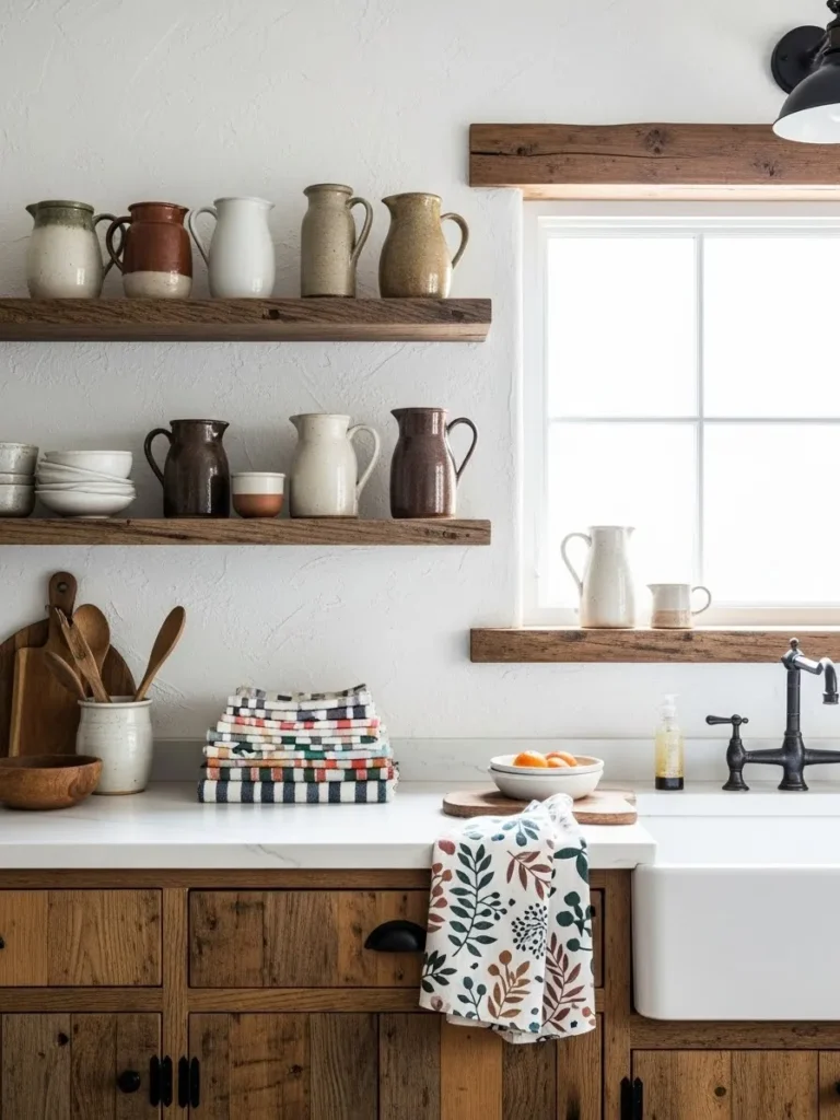 This sweet little boho farmhouse kitchen leans into simplicity with so much personality. The warm wood tones of the lower cabinets instantly ground the space while the floating shelves bring a relaxed, airy feeling. Each shelf is lined with handmade ceramic pitchers in earthy colors that make the whole room feel collected and lovingly lived in. The crisp white walls keep things bright while the rustic window trim and vintage inspired faucet add that cozy farmhouse charm. A stack of colorful striped dish towels and a leafy printed kitchen cloth bring just the right touch of playful boho energy.