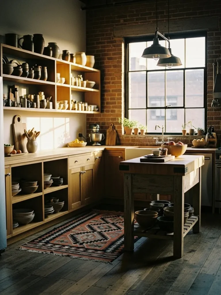 This kitchen brings together the sweetest mix of rustic farmhouse warmth and boho soul. The exposed brick wall instantly adds texture while the big industrial style window lets in that dreamy late afternoon light every Pinterest girl loves. Light wood cabinets and open shelving keep things airy and practical with stacks of handmade pottery giving the whole space a cozy, lived in feel. The patterned rug softens the room and adds just the right hint of color while the chunky wooden island anchors everything beautifully. It feels functional but also wonderfully collected as if every bowl and cutting board has a story behind it.