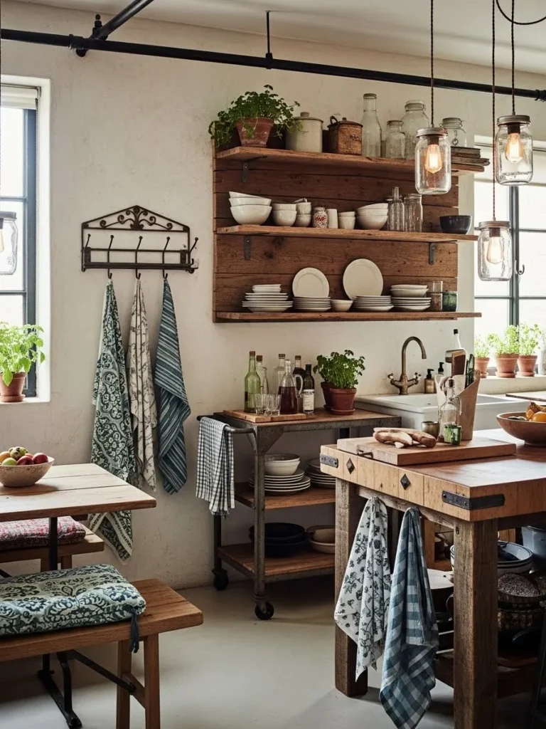 This kitchen brings together the sweetest mix of rustic farmhouse texture and relaxed boho personality. The open wood shelving instantly feels welcoming, filled with stacked ceramics, vintage jars, and little potted herbs that make the space feel alive. Soft patterned textiles hang neatly from hooks and counters, adding color without overwhelming the calm neutral backdrop. The butcher block island and rolling cart create that perfectly imperfect collected look that makes a kitchen feel like it has a story. Warm pendant lights in mason jar shades glow above the workspace, giving everything a cozy lived in atmosphere that feels both practical and beautiful.