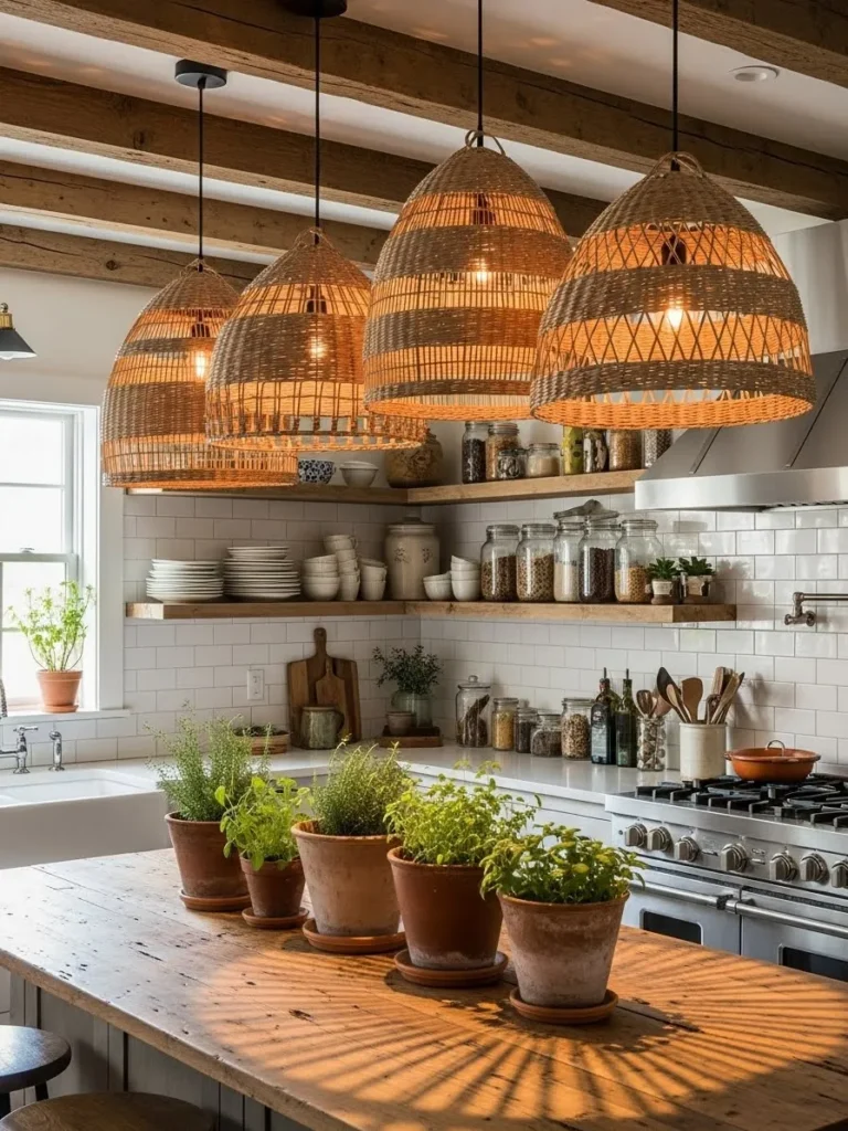 This kitchen brings together all the cozy boho farmhouse ingredients in the prettiest way. The woven pendant lights cast the most gorgeous patterned glow across the rustic wood island, giving the whole room an inviting warmth. Open shelving keeps everything feeling airy and casual while the mix of white dishes, glass jars, and little touches of wood adds that effortless collected look. The white subway tile keeps things fresh and clean, and those potted herbs lined up on the island make the space feel so alive. It is the kind of kitchen where you instantly imagine long mornings, fresh bread, and a soft breeze drifting through the window.