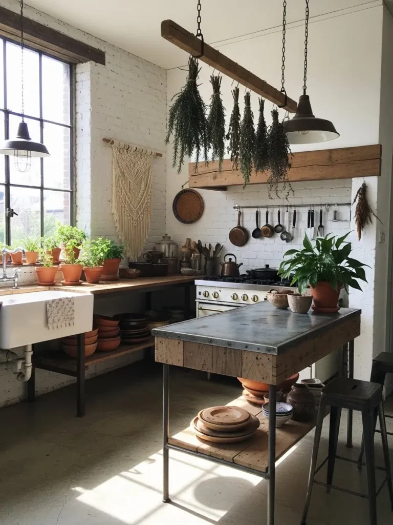 This kitchen feels like it was designed by someone who loves morning sun, fresh herbs and a little bit of creative chaos in the best possible way. The white brick walls brighten the space while the oversized industrial window lets in gorgeous natural light that makes every terracotta pot glow. A mix of open shelving, a farmhouse sink and a perfectly worn metal topped island creates that relaxed boho farmhouse balance. The hanging herbs, macrame wall art and simple metal pendants give the room a soft handcrafted vibe. Everything feels collected over time which makes the whole space incredibly warm and inviting.