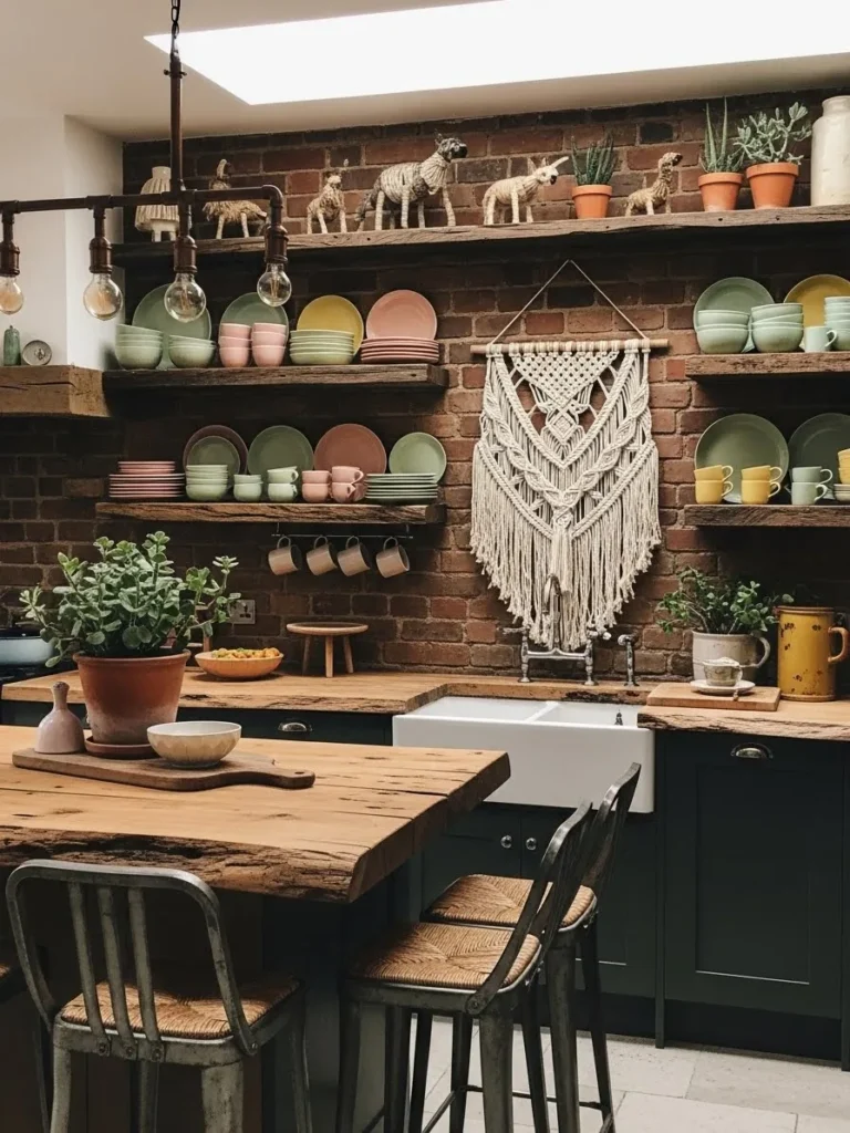 This kitchen brings together all the cozy boho farmhouse energy with a mix of rustic textures and playful artistic touches. The exposed brick wall creates a warm backdrop for chunky reclaimed wood shelves filled with pastel dishes that feel soft and inviting. A macrame wall hanging adds a handmade touch that instantly gives the space a relaxed personality. The woven stools, vintage style metal chairs, and farmhouse sink all blend beautifully with the live edge wood countertops. Little potted plants and quirky animal figurines finish everything off with a fun and creative vibe that feels lived in and loved.