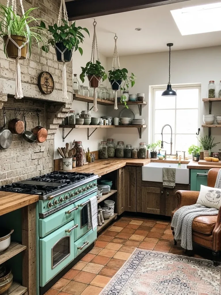 This kitchen brings together the sweetest blend of rustic textures and artistic boho warmth. The vintage mint green stove instantly steals the spotlight, giving the whole space a playful pop of color that feels both nostalgic and fresh. Open shelving filled with ceramics and jars keeps everything within easy reach and adds that lived-in charm we all adore. The warm terracotta floor tiles and chunky wooden countertops ground the room with earthy tones while hanging macramé planters introduce a soft and leafy touch. A farmhouse sink sits right by the window and soaks up the natural light from the skylight above, making everyday chores feel a bit more peaceful. The mix of brick, wood, greenery and cozy seating turns this corner into a kitchen that feels collected and loved over time.