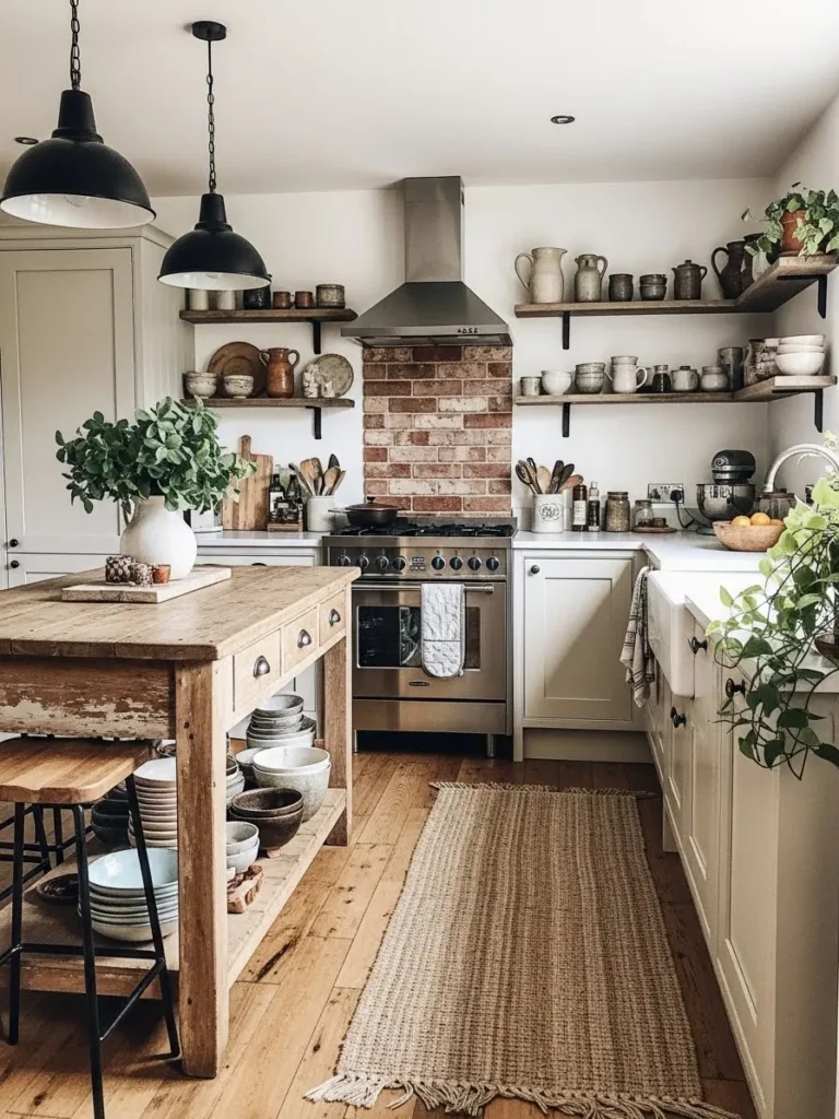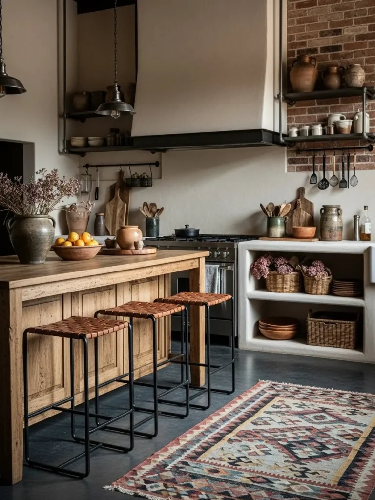 This kitchen blends rustic farmhouse warmth with soft boho artistry in the prettiest way. The natural wood island adds a cozy anchor to the space while the woven leather stools instantly bring in that relaxed handcrafted feel. Open shelving filled with pottery and textured ceramics creates an effortless collected look. The mix of brick, creamy walls, matte black accents, and those charming hanging utensils makes the whole space feel lived in and loved. The patterned rug pulls everything together with its earthy colors and boho personality that gently softens all the harder lines.
