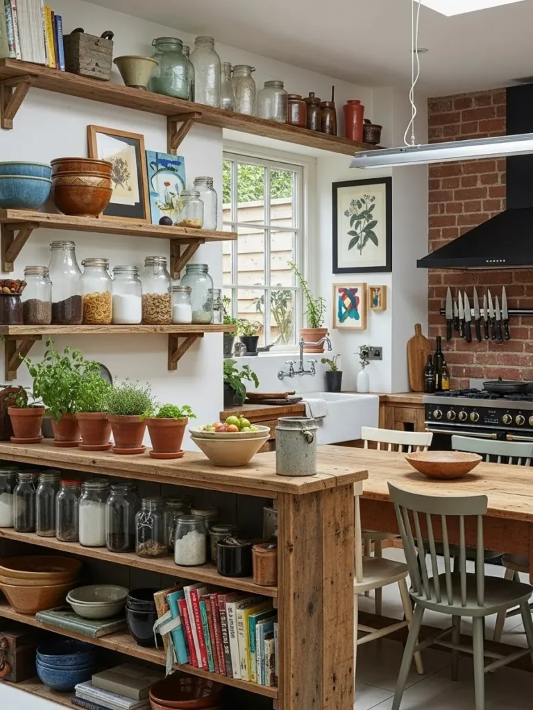 This boho farmhouse kitchen feels like the happiest mix of rustic charm and everyday practicality. The warm wood tones instantly soften the space, especially with those beautifully weathered open shelves lined with jars, handmade bowls, and little treasures that look like they’ve been gathered over the years. The potted herbs bring in such a sweet touch of life and color, and that big farmhouse sink paired with the exposed brick wall adds just the right amount of texture. I love how everything feels open and welcoming, with storage that doubles as decoration and a layout that encourages slow mornings and cozy cooking sessions.