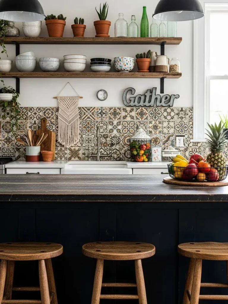 This kitchen blends boho personality with farmhouse warmth in the sweetest way. The patterned tile backsplash sets the tone with its artistic, mosaic look while the floating wood shelves keep everything feeling light and effortless. Terracotta pots, quirky bowls, and little succulents bring in that relaxed collected feel. The cozy macramé wall hanging adds softness against all the earthy textures. A dark island anchors the space with rustic character while the simple wooden stools keep the vibe unfussy. Every detail feels curated yet wonderfully lived in.