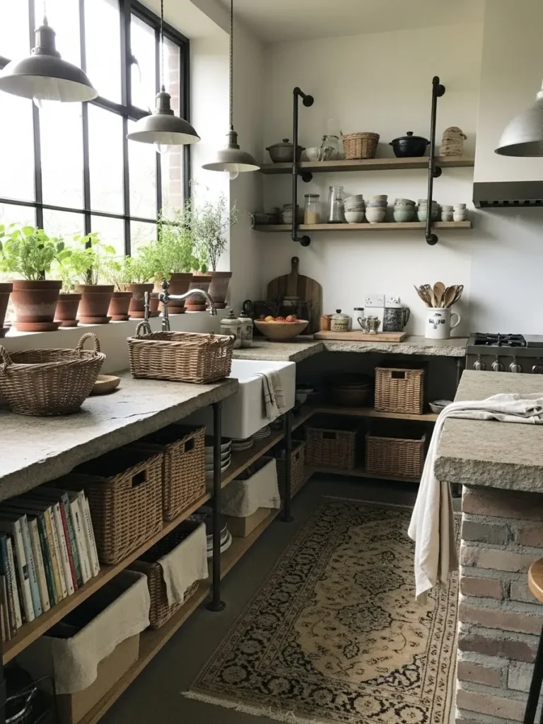 I love how this design feels both organized and beautifully lived in. The open shelves make the whole space feel airy while the baskets keep things from looking chaotic. The mix of textures is so soothing and the little moments like the potted herbs and vintage style rug make me want to linger here with a cup of tea. It is that perfect blend of rustic charm and creative personality that always makes me smile.