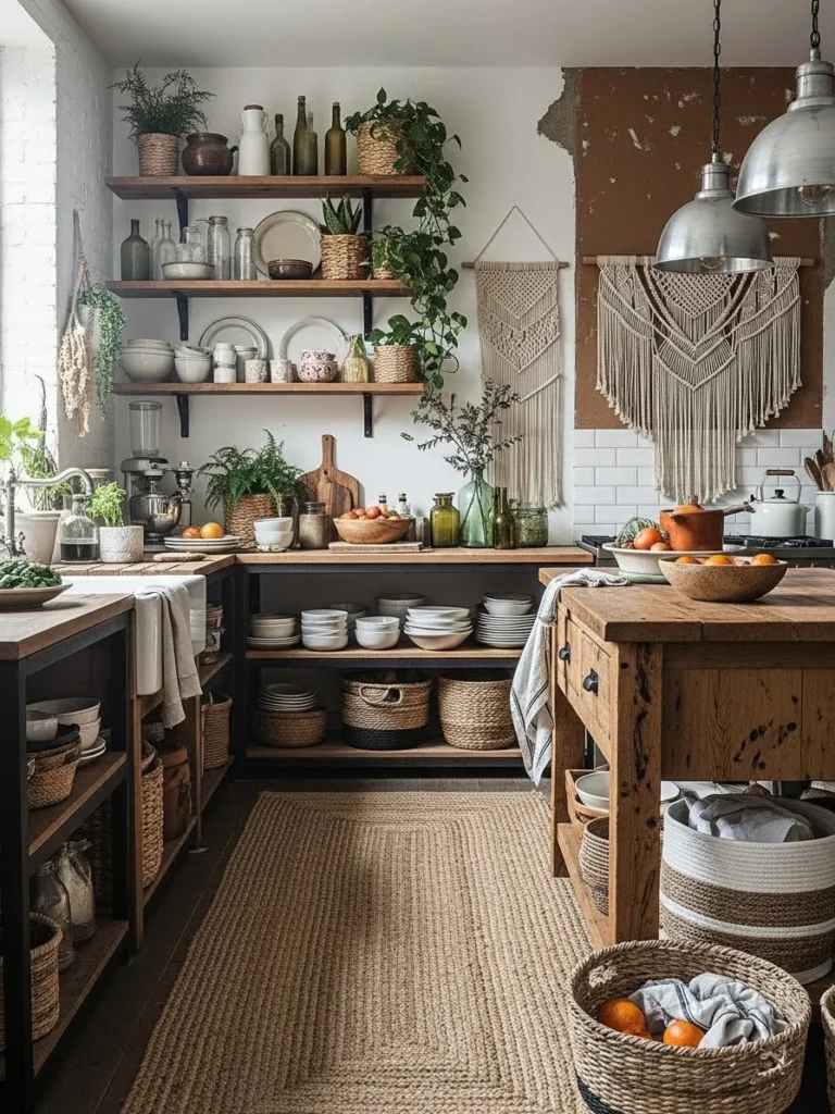 This kitchen brings such a warm and relaxed energy with its mix of natural textures and beautifully layered decor. The open shelving feels casual and practical with stacks of simple ceramics, woven baskets, and glass bottles that look like they were collected over time. The soft greenery adds a gentle touch while the macrame wall hangings give the whole space that artsy boho personality. I love how the rustic wood tones from the island and shelving blend with the crisp white walls and subway tile. Everything feels thoughtfully styled yet wonderfully lived in which is exactly the magic of a boho farmhouse kitchen.