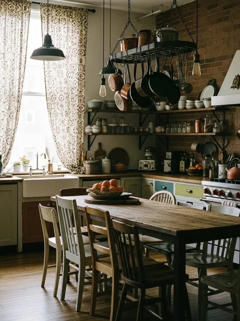 This charming kitchen blends rustic farmhouse character with easygoing boho style in the sweetest way. The weathered wood table sets the tone with its lived in beauty while the collection of mismatched chairs adds a playful and effortless feel. Open shelving shows off stacks of pottery and glassware that look lovingly gathered over time. Soft patterned curtains filter the light and make the space feel calm and cozy. The hanging pot rack with copper pans brings a bit of artistic flair that fits the boho spirit perfectly. Every corner feels warm inviting and full of quiet personality.