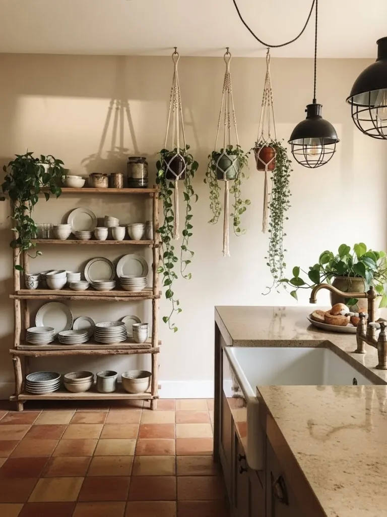 This kitchen has such a warm and comforting glow thanks to its terracotta tile floor and soft neutral walls. The rustic wooden shelving feels like it was gathered from a charming countryside market and it’s filled with simple ceramic pieces that give the space an easy collected feel. The macrame plant hangers add a breezy boho touch and the trailing greenery softens the room in the prettiest way. Paired with the farmhouse sink and smooth stone countertops the whole space feels grounded natural and wonderfully relaxed.