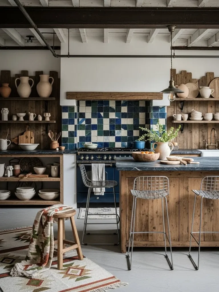 This kitchen blends relaxed artistry with that warm lived in farmhouse feel. The eye goes straight to the mosaic tile backsplash with its deep blues and soft greens that bring such a gorgeous pop of color against all the natural wood. The open shelves feel collected and effortless with pottery and everyday pieces that look like they were gathered over time. The weathered island has the sweetest texture and pairs so well with the wire stools which add a little modern lightness. I also adore the cozy patterned rug that softens the space and gives it that boho touch that feels relaxed without trying too hard.