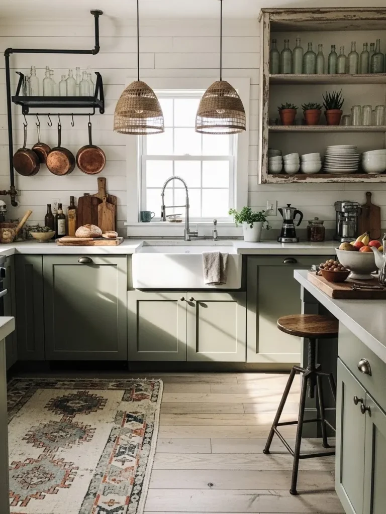 This charming boho farmhouse kitchen blends soft sage green cabinets with weathered textures that feel instantly inviting. The white shiplap walls create a bright backdrop for the woven pendant lights and open shelving filled with simple ceramics and vintage bottles. Copper pans bring a warm glimmer that pairs beautifully with the natural wood accents scattered throughout the space. The patterned rug adds that perfect touch of relaxed artistry and ties the whole room together in a way that feels both curated and effortlessly lived in.