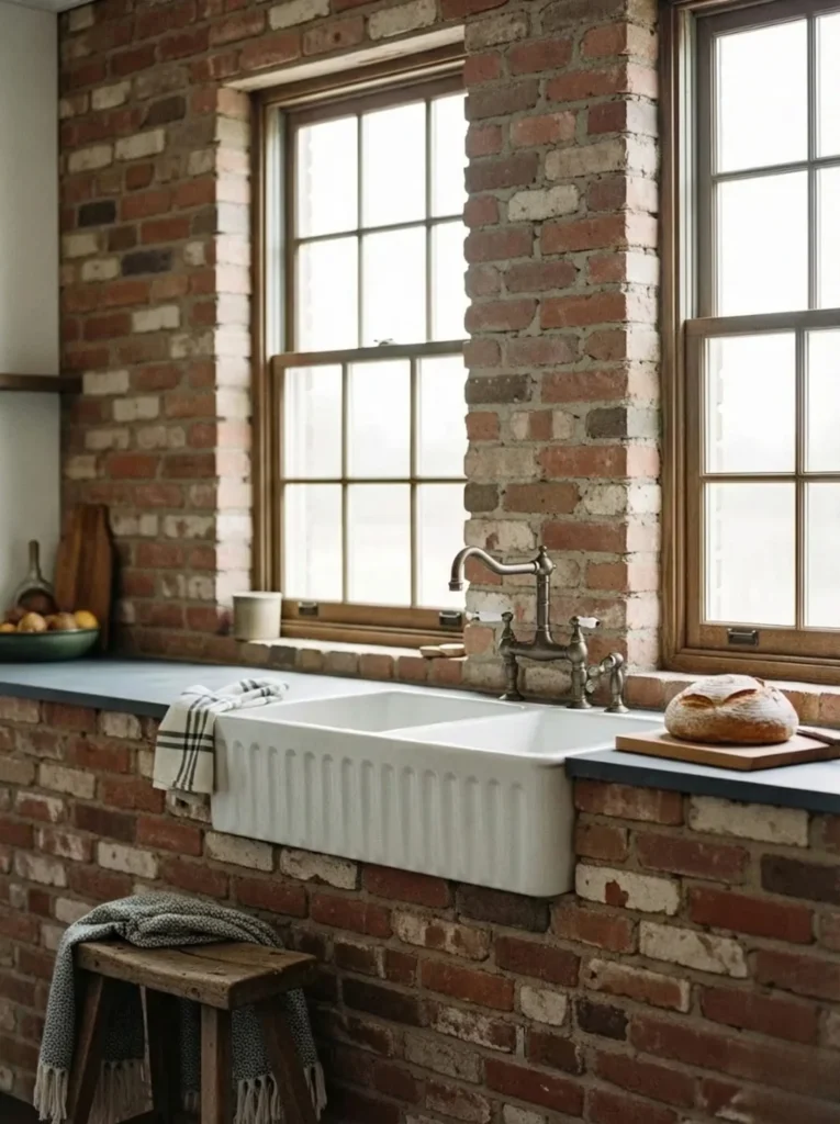 Classic Farmhouse Sink Wall with Rustic Brick Charm