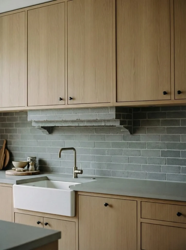 This kitchen brings together the prettiest mix of soft gray brick and warm oak cabinetry, creating a look that feels calm, clean and wonderfully grounded. The brick backsplash adds gentle texture without overpowering the space, and I love how the subtle shading gives everything a handcrafted feel. The farmhouse sink sits beautifully beneath the brushed brass faucet, and the simple black hardware adds just the right amount of contrast. Everything feels intentional yet effortless, the kind of kitchen that always looks put together even on a busy day.