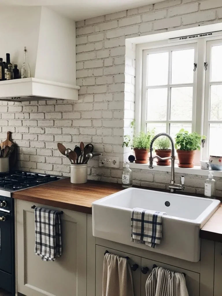 This kitchen brings together the sweetest mix of charm and comfort with its soft whitewashed brick backsplash that instantly warms up the entire space. The texture of the brick feels relaxed and lived in while the creamy tone keeps everything bright and cheerful. Paired with warm wood countertops, a deep farmhouse apron sink, and classic checkered towels, the whole area feels thoughtfully layered without trying too hard. Little touches like potted herbs in the windowsill, vintage inspired soap bottles, and matte cabinetry in a gentle sage tone add even more personality without overwhelming the room.