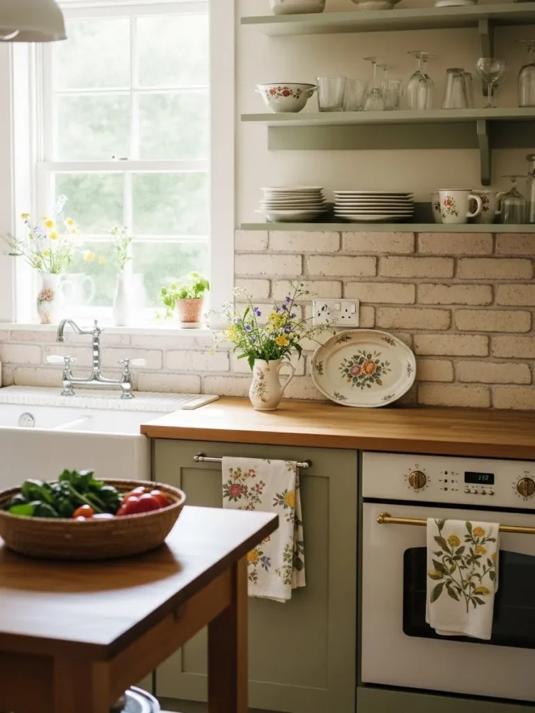 This kitchen has such a gentle and welcoming spirit with its soft cream brick backsplash paired beautifully with those muted sage cabinets. The open shelving keeps everything feeling airy and relaxed, especially with the sweet floral dishes and glassware on display. The warm wood countertops add a comfy farmhouse touch that feels both homey and polished. I also love how the big farmhouse sink sits right by the window so all that natural light pours in and makes the whole space feel fresh and calm. Little details like the floral tea towels, the wildflower bouquet, and the bowl of freshly picked produce help the room feel lived in without being cluttered.