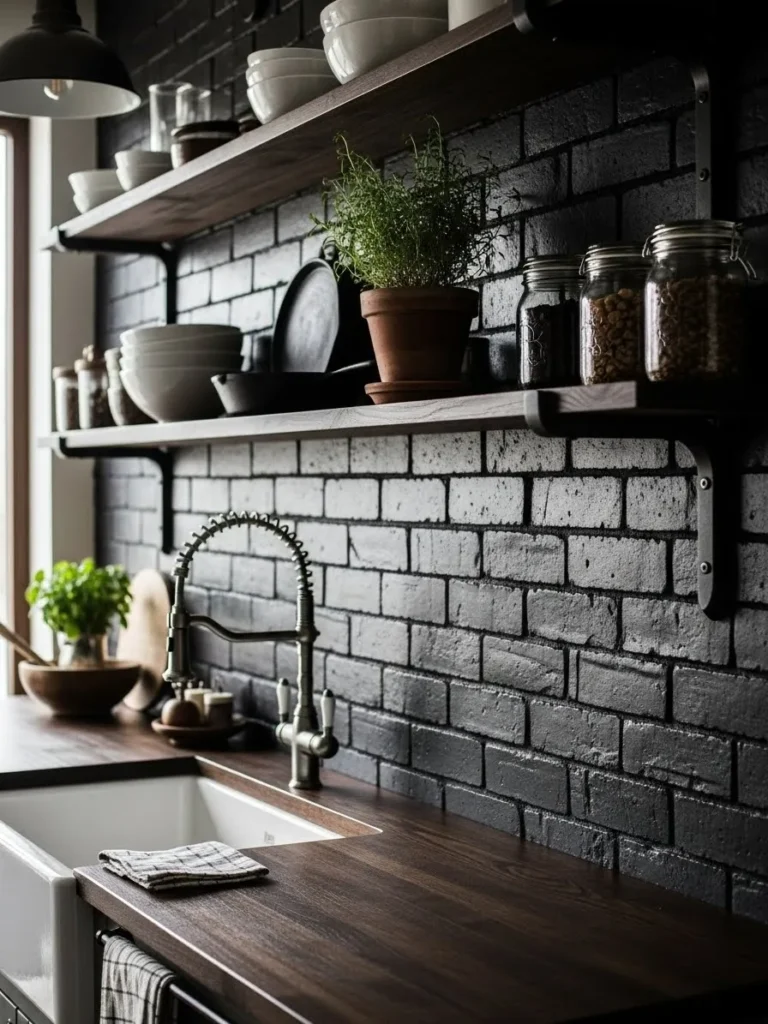 This kitchen brings a bold twist to classic farmhouse style with its stunning black brick backsplash that instantly steals the spotlight. The matte texture adds a little drama without feeling overwhelming, especially when paired with those beautiful dark wood countertops that look rich and grounding. The open wooden shelves soften the look and keep everything feeling airy and lived in, with stacked white dishes and jars adding just the right amount of cozy everyday charm. The farmhouse sink and vintage inspired faucet balance the mood perfectly, creating a space that feels both modern and homely at the same time.